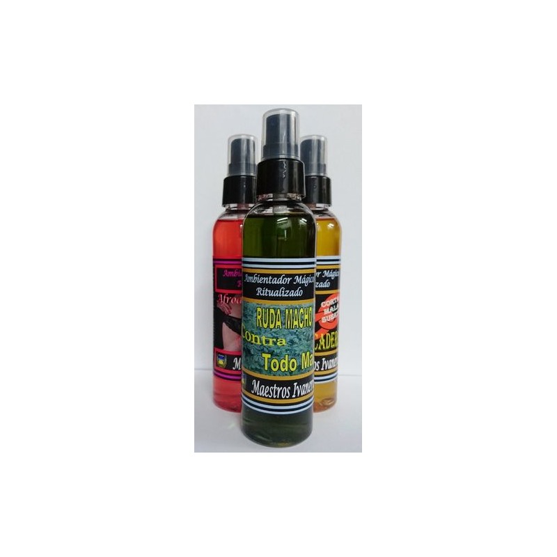 Ambientador con agradable aroma, preparado especialmente para erradicar toda clase de negatividades, trabajos sucios, y alejar personas de mala fe. Contenido 100 ml.
