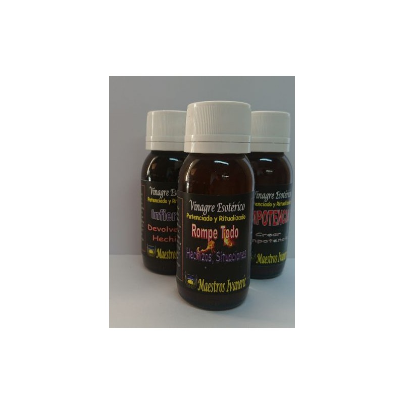 Vinagre Especial Impotencia, crear Impotencia elaborado artesanalmente. Se usa arrojándolo al suelo, fregona, unciendo velas, etc. Prohibido su uso por vía oral o cutánea. Botellita 60ml.
